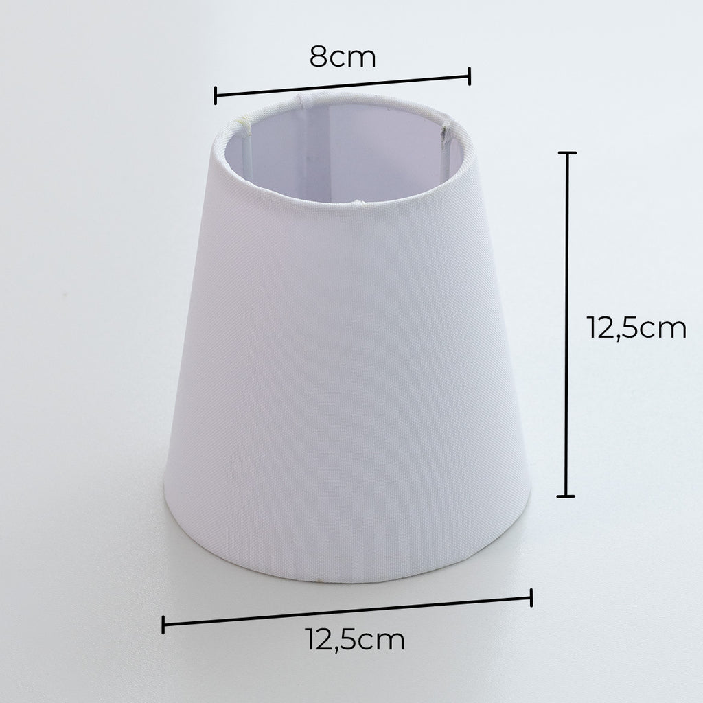 Ele é produzido pela Spotline, em alumínio com acabamento dourado polido, com a cúpula de tecido na cor branca.