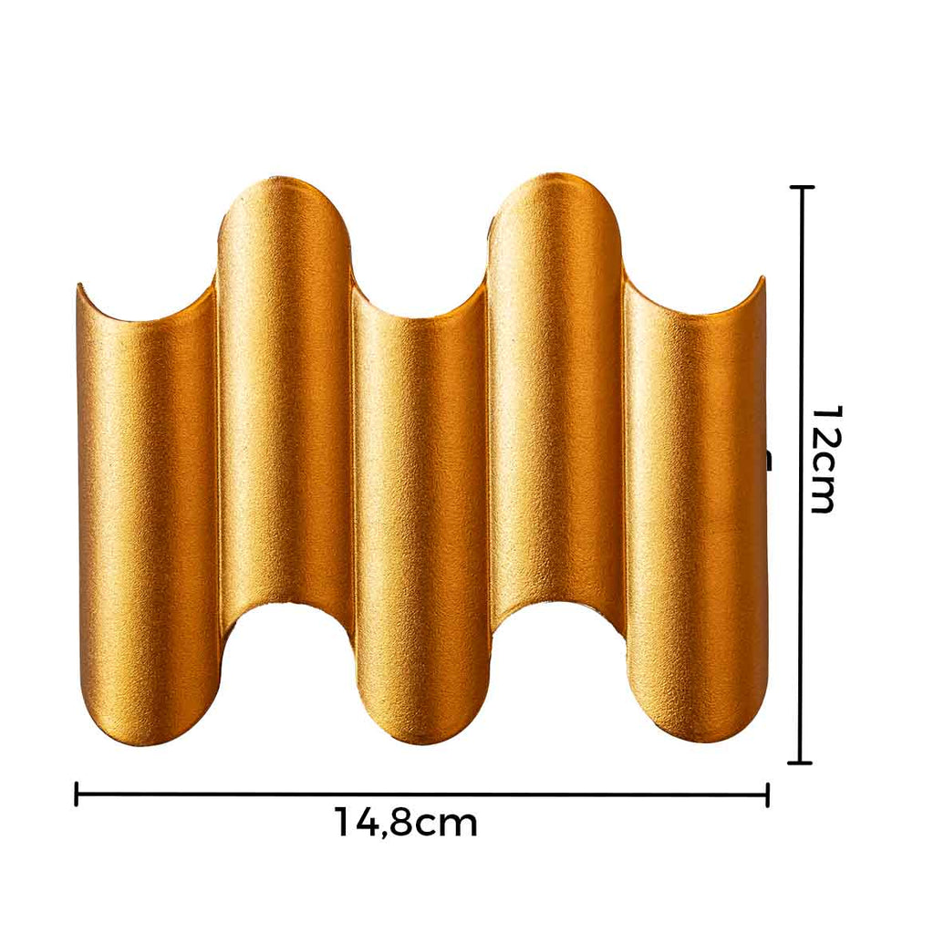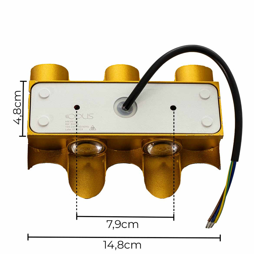 Ela é produzida em alumínio e vidro, na cor preta ou dourada, com LED integrado de 3000K, branco quente, 300 lumens de fluxo luminoso e 5W de potência.