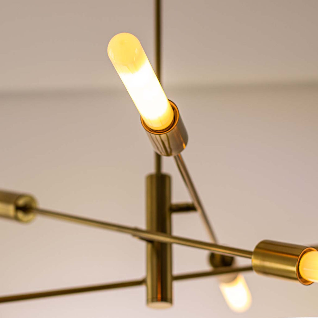 Ele mede 52 cm de largura, 57 cm de altura total e 52 cm de profundidade, e é composto por 3 hastes direcionáveis que comportam 6 lâmpadas com base E-27, 1 em cada extremidade, vendidas separadamente.