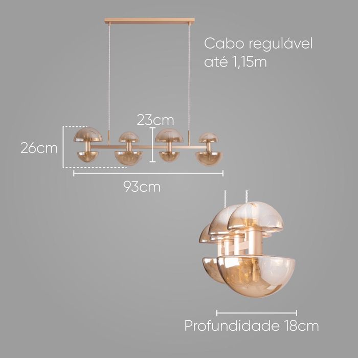O que vem na caixa? 01 Pendente Artemis Ouro Fosco e Ambar Vidro VL002-AB 93cm para 8 G9 Starlux ST2541