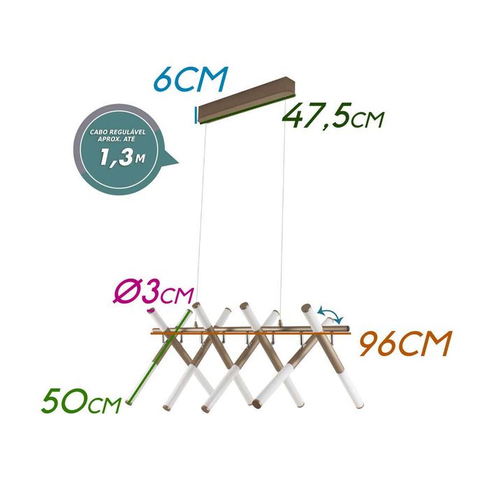 Tamanho Aproximado (LxAxP) 96 cm de largura total; Palito: 50 cm de comprimento x 3 cm de diâmetro