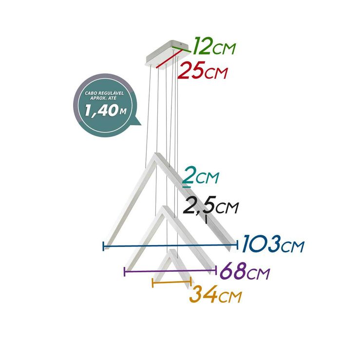 Tamanho Aproximado (LxAxP) 103 cm de largura máxima; Espessura de cada arranjo: 2cm x 2,5cm