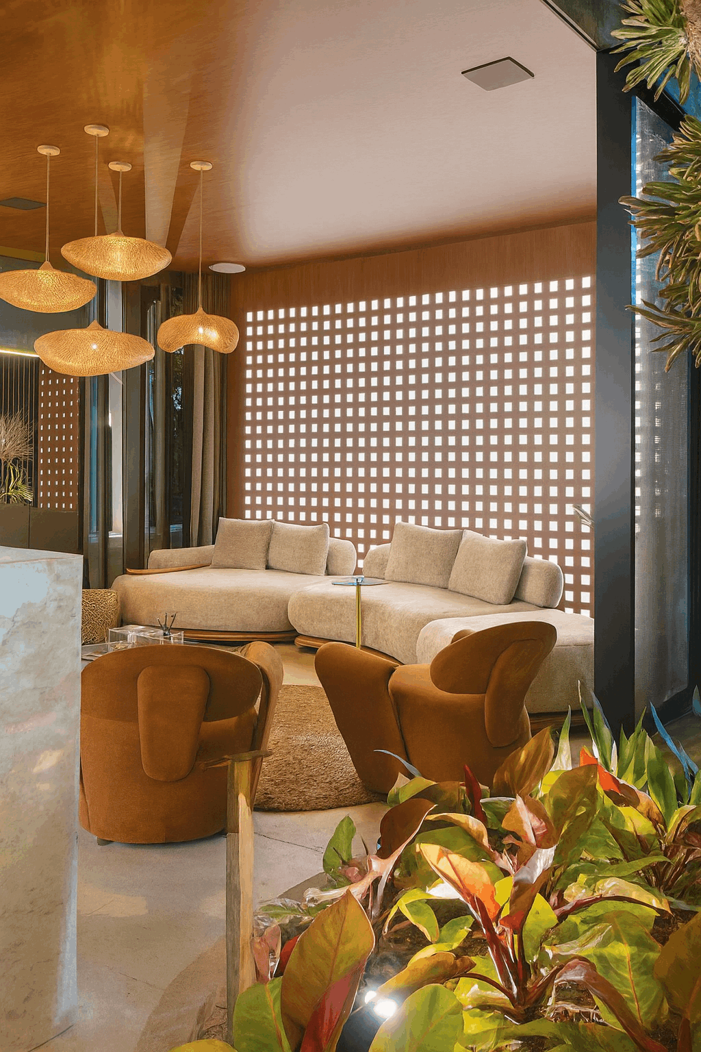 Neste projeto de interiores, assinado pela Naira Araújo Arquitetura, fica evidente como a aplicação da tela tensionada atrás do painel quadriculado pode elevar o resultado final, trazendo modernidade, conforto visual e integração estética ao ambiente.